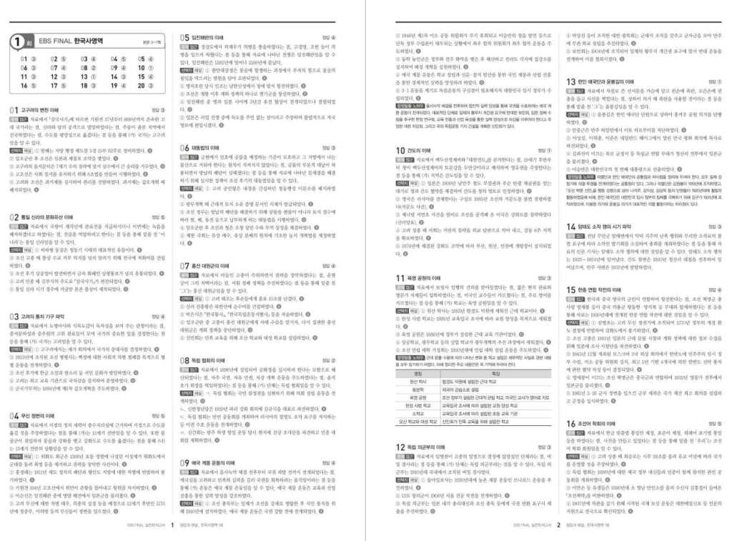 EBS FINAL 실전모의고사 한국사영역은 짧은 시간 안에 전체적인 흐름을 점검하고 싶은 수험생, 혹은 안정적인 1등급을 목표로 반복 학습을 원하는 학생에게 적합한 교재입니다. 수능 전 최종 점검은 물론, 6월과 9월 모의고사 대비용으로도 활용하기 좋으며, 단권으로도 충분한 분량과 내용을 담고 있어 부담 없이 학습할 수 있습니다. 본문에 2026 파이널 실전 모의고사 한국사 답지를 첨부해두었으니 필요하신 분들은 이용하시길 바랍니다.