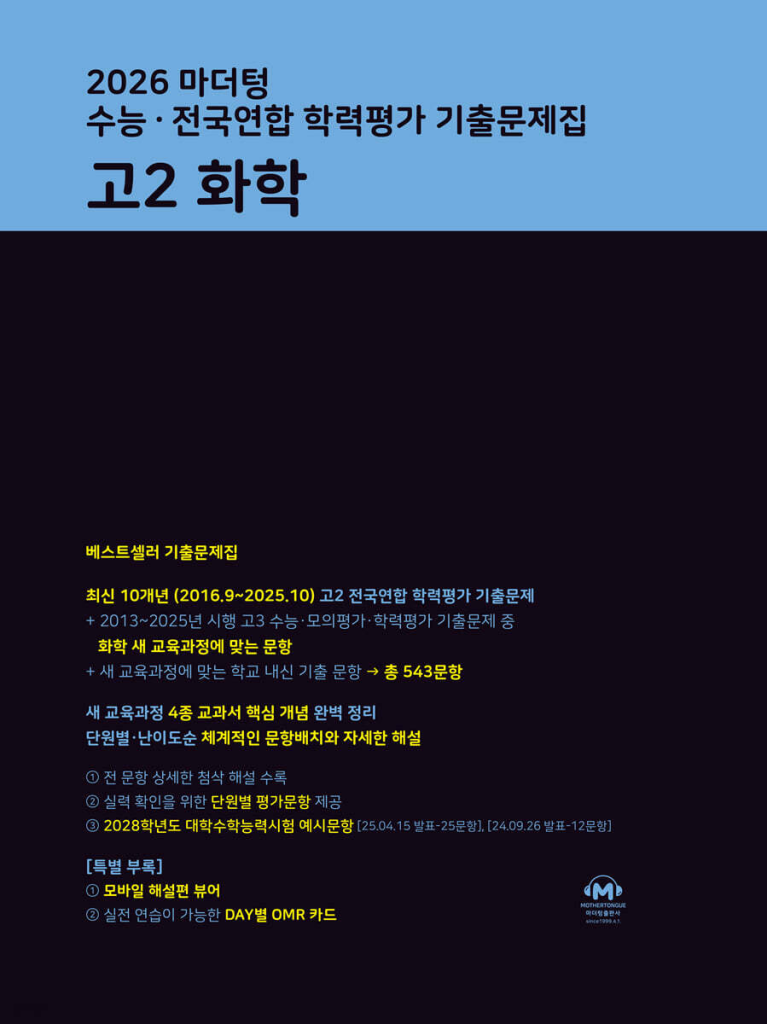 마더텅 수능·전국연합 학력평가 기출문제집 고2 화학 (2026년)은 2022 개정 교육과정을 반영하여 고등학교 화학 과목의 기출문제를 체계적으로 정리할 수 있도록 구성된 실전 대비 교재입니다. 화학은 개념 이해와 함께 계산과 적용 능력이 중요한 과목인데, 이 교재는 최신 기출문제를 중심으로 반복 학습이 가능하도록 설계되어 있어 내신과 수능을 동시에 준비하려는 학생에게 적합합니다. 아래에 마더텅 고2 화학 답지를 올려두도록 하겠습니다. 매년 바뀌므로 표지를 꼭 확인하시길 바랍니다.