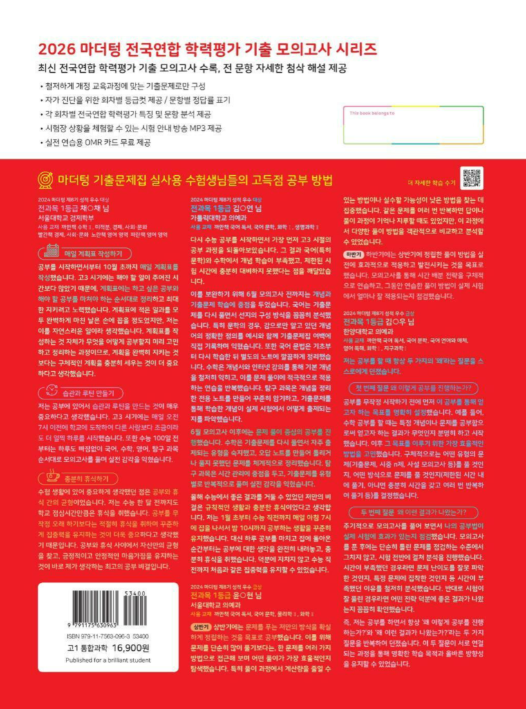 마더텅 전국연합 학력평가 기출 모의고사 6개년 22회 고1 통합과학(2026년)은 고1 통합과학을 시험처럼 많이 풀어 보게 만드는 기출 모의고사형 문제집입니다. 통합과학은 개념이 넓게 퍼져 있고, 한 단원만 잘해도 점수가 오르는 과목이 아니라서, 여러 회차를 풀면서 자주 나오는 표현과 함정을 익히는 게 중요합니다. 이 책은 그 역할을 하도록 모의고사 형태로 구성되어 있습니다. 아래 마더텅 빨간책 고1 통합과학 기출모의고사 22회 답지 파일을 첨부해두도록 하겠습니다. 매년 개정되므로 표지를 꼭 확인하시길 바랍니다.