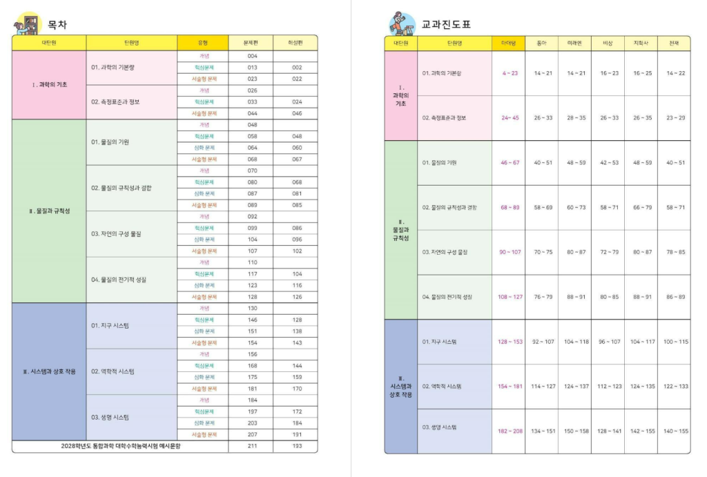 구성은 개념 학습 → 유형 문제 → 단원 정리 → 실전 평가로 이어지는 단계형 학습 구조로 되어 있어 학습 흐름이 매우 명확합니다. OX 문제와 단답형, 서술형 문제까지 다양하게 포함되어 있어 시험 유형에 익숙해질 수 있으며, 특히 2028학년도 수능 예시문항이 함께 수록되어 있어 실전 감각을 미리 익힐 수 있습니다. 해설 또한 매우 자세하게 제공되어 혼자 학습하는 학생도 충분히 이해할 수 있도록 돕습니다.