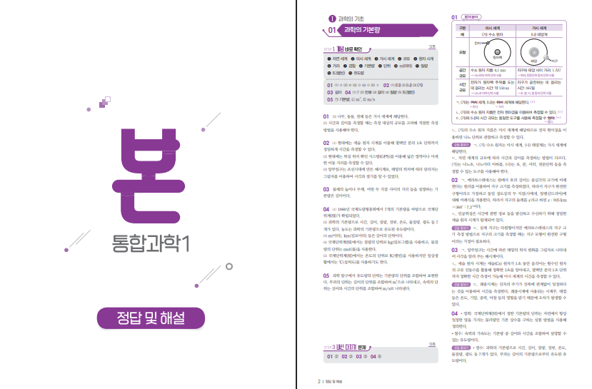 구성은 ‘과학의 기초–물질과 규칙성–시스템과 상호작용’의 큰 틀로 이어집니다. 기본량과 측정에서 단위·표기 습관을 바로잡고, 원소와 물질의 규칙성·성질로 넘어가 화학적 사고를 정돈한 뒤, 지구·역학·생명 시스템을 통합 관점으로 묶어 현상 간 인과를 파악하도록 돕습니다. 단원 내 소단원들이 앞뒤 맥락으로 유기적으로 이어지도록 설명이 설계되어 있어, 한 개념을 배우면 다음 개념의 이해가 쉬워지는 연쇄 효과를 기대할 수 있습니다.