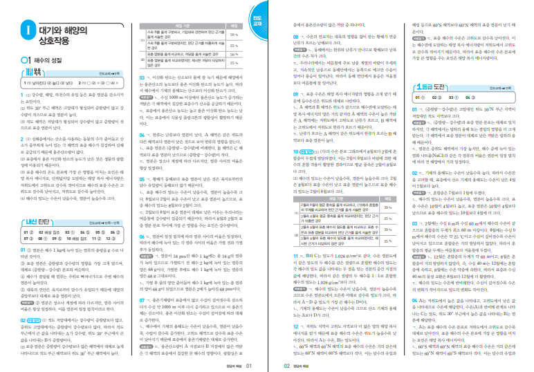 이 책의 내용은 대기와 해양의 상호작용, 지구의 역사와 한반도의 암석, 태양계 천체와 우주의 진화 등 주요 단원으로 구성되어 있습니다. 해수의 성질과 해수 순환, 기압과 날씨 변화, 태풍과 기후 변화 같은 대기와 해양 관련 내용부터 지층의 형성과 암석, 지질 시대의 환경까지 지구의 역사에 대한 내용도 다루고 있습니다. 또한 태양계 행성의 운동, 별의 진화, 은하와 우주의 구조까지 폭넓은 내용을 학습할 수 있습니다. 각 단원은 그림과 도표를 중심으로 설명되어 있어 복잡한 내용을 한눈에 이해하기 쉽다는 점이 특징입니다. 아래 링크를 통해 지구과학 오투 답지를 열람할 수 있습니다.