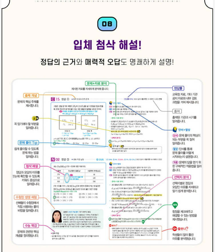 활용 팁은 간단합니다. 먼저 A부터 N까지 개념을 빠르게 훑고 바로 문제로 들어가서, 틀린 문제는 해설에서 단서 발상 적용 흐름을 그대로 따라가며 왜 그런지까지 확인하면 됩니다. 특히 결합 극성 분자 구조 평형 이동 중화 적정은 비슷한 유형이 계속 나오기 때문에, 한 번 틀린 포인트를 표시해 두고 다음 회차에서 같은 실수가 다시 나오는지 체크하는 방식이 효과적입니다. 동영상 강의 QR코드도 있어서 자료 해석이 막힐 때 빠르게 보충하기 좋습니다.