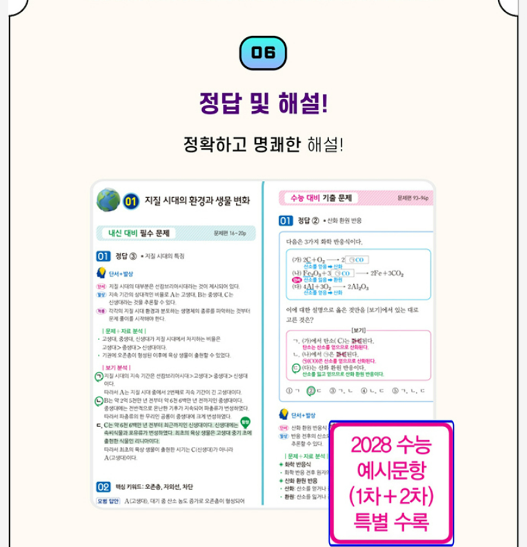 또한 수능 유형 특강과 수능 대비 기출 문제를 통해 고1 단계에서 수능 접근법을 자연스럽게 익히게 하고, 2028학년도 수능 예시문항 1차와 2차를 수록해 변화된 출제 방향도 미리 경험할 수 있습니다. 해설은 단서 찾기와 발상 과정을 단계별로 설명해 주어 혼자 공부하기에도 부담이 적습니다. 중요한 문항은 동영상 강의 QR로 보완할 수 있어 복습 효율도 좋습니다. 내신과 수능을 함께 대비하기에 매우 좋습니다. 매년 개정되므로 표지 확인은 꼭 하시고, 본문에 2026 자이스토리 통합과학2 답지 pdf 첨부해 두었습니다.