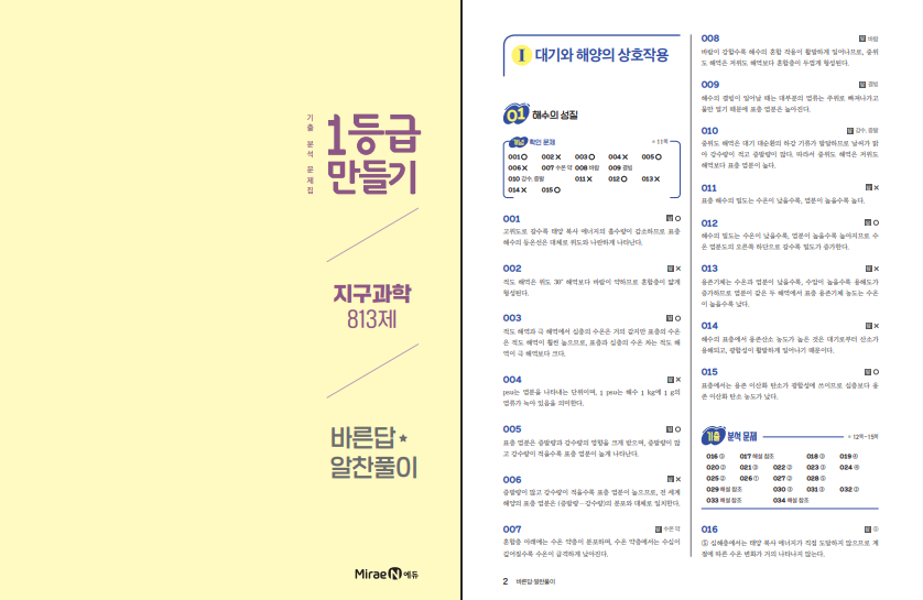 구성을 보면 크게 대기와 해양의 상호작용, 지구의 역사와 한반도의 암석, 태양계 천체와 별과 우주의 진화로 나누어져 있습니다. 앞부분에서는 해수의 성질과 순환, 기압과 날씨 변화, 태풍, 엘니뇨와 기후 변화처럼 자주 나오는 주제를 다룹니다. 이어서 지층과 암석의 나이, 퇴적 환경, 화성암과 변성암을 정리하고, 마지막에는 태양계 천체의 운동, 별의 물리량, H-R도, 우주 팽창 같은 내용까지 이어집니다. 학교 시험 범위에서 중요한 단원들이 빠짐없이 들어 있어 예습용으로도 좋고 시험 직전 정리용으로도 활용하기 좋습니다. 아래 링크를 통해 지과 1등급만들기 답지를 열람할 수 있습니다.