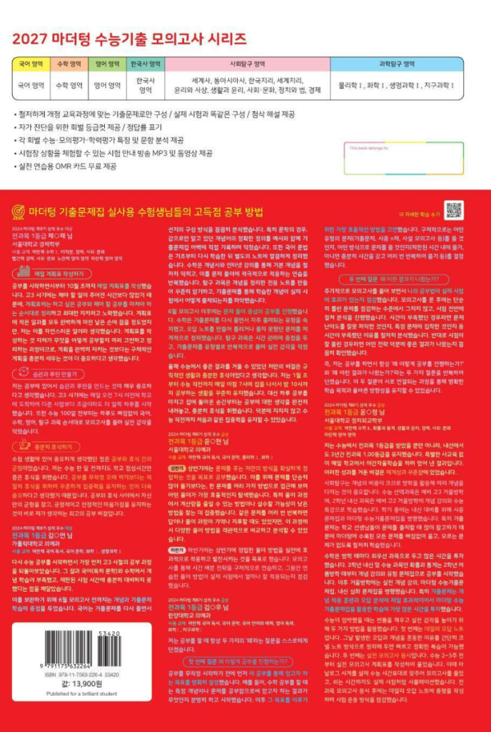 이 교재의 장점은 단순히 문제만 모아 둔 것이 아니라 해설과 실전 자료까지 함께 제공한다는 점입니다. 전 문항 문제 풀이 동영상 강의가 제공되고, 첨삭 해설도 수록되어 있어서 혼자 공부하는 학생도 비교적 수월하게 복습할 수 있습니다. 회별 등급컷과 정답률, 문항 분석 자료도 함께 볼 수 있어 자신이 어느 단원에서 약한지 점검하기 좋습니다. 또 실제 수능과 비슷한 OMR 카드와 안내 방송 자료까지 제공되기 때문에 시간을 재고 실전처럼 푸는 훈련을 하기에 적합합니다. 물리는 특히 실전에서 긴장하면 계산 실수가 늘어나기 쉬운데, 이런 연습을 반복하면 시험장 적응력이 좋아집니다.