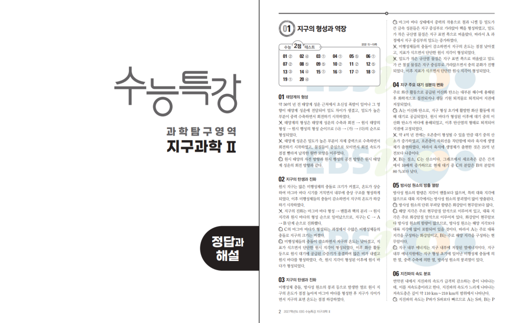 마지막으로 수능특강은 수능 연계 비중이 높은 교재이기 때문에 수험생이라면 선택이 아니라 필수에 가까운 교재입니다. 답지를 볼 때는 반드시 2027 수능 대비용, 즉 2026년 발행 최신 개정판인지 표지를 확인하는 것이 중요합니다. 매년 표지가 바뀌고 그 자체로도 이슈가 될 만큼 유명한 교재인 만큼, 연도가 다른 답지를 참고하면 혼란이 생길 수 있습니다. 본문에서 제공되는 2027 수능특강 지구과학2 답지 PDF를 첨부해두었습니다. 함께 활용하면 개념 정리와 실전 대비를 동시에 진행하는 데 큰 도움이 됩니다.