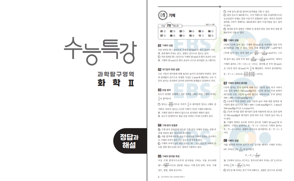 EBS 수능특강 과학탐구영역 화학2는 과탐을 선택한 학생이 수능 흐름에 맞춰 개념과 문제를 같이 잡기 좋은 기본서입니다. 화학2는 내용이 한 번에 확 어려워 보이지만, 실제로는 단원별 핵심 개념을 정확히 이해하고 계산과 그래프 해석을 반복하면 점수가 올라가는 과목입니다. 이 책은 기체, 액체와 고체, 용액처럼 기본 단원부터 시작해서 평형, 속도, 전기화학까지 수능에서 자주 묻는 큰 줄기를 빠짐없이 이어줍니다. 아래 2027학년도 수능특강 화학2 답지 pdf 올려두겠습니다. 표지를 꼭 확인하시길 바랍니다.