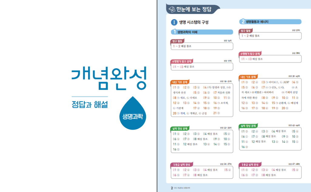 이 책은 크게 생명 시스템의 구성, 항상성과 몸의 조절, 생명의 연속성과 다양성으로 구성되어 있습니다. 첫 단원에서는 기본 관점, 생태계 상호작용을 다루는데, 외우기만 하기보다 왜 그렇게 되는지를 연결해서 이해해야 점수가 잘 나옵니다. 두 번째 단원은 신경 자극 전도와 시냅스 전달, 항상성 조절, 면역과 방어 작용처럼 시험에 자주 나오는 핵심 파트가 많습니다. 마지막 단원은 염색체와 유전 정보 전달, 진화와 다양성으로 이어지는데, 표와 그림을 읽는 문제가 많이 나오니 개념을 구조로 정리해 두는 것이 중요합니다. 아래 링크로 개념완성 생명과학 답지를 열람할 수 있습니다.