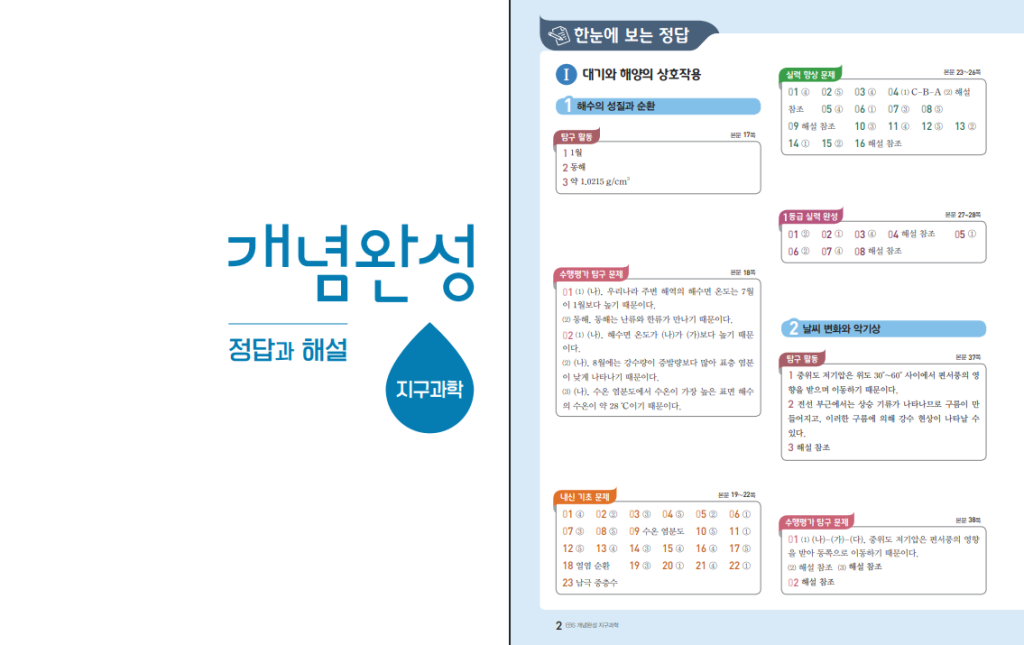 단원 구성은 대기와 해양의 상호작용, 지구의 역사와 한반도의 암석, 태양계와 우주의 진화로 이어집니다. 첫 단원에서는 해수의 성질과 순환, 날씨 변화와 악기상을 다루는데, 그림과 자료를 읽는 힘이 중요합니다. 두 번째 단원은 지층과 암석, 지질 시대처럼 시간의 흐름을 이해하는 내용이 중심이라 정리가 잘 되어 있어야 합니다. 마지막 우주 단원은 태양계 천체, 별, 은하까지 범위가 넓어서 개념을 구조적으로 묶어 두는 것이 필요합니다. 아래 링크로 지과 개념완성 답지를 열람할 수 있습니다.