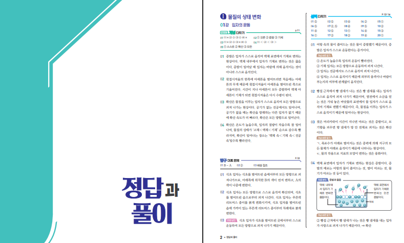 위 링크를 통해 화학 ESC 답지를 열람할 수 있습니다. 학습 과정은 단계적인 문제 구성으로 이루어져 있습니다. 먼저 개념 정리를 통해 기본 내용을 이해한 뒤, 개념 다지기 문제로 핵심을 다시 확인할 수 있습니다. 이후 실력 다지기 문제에서는 학교 시험에서 자주 나오는 유형을 중심으로 연습할 수 있어 내신 대비에도 도움이 됩니다. 최근 평가에서 비중이 커진 서술형 문제도 단계적으로 제시되어 있어, 풀이 과정을 글로 설명하는 연습을 자연스럽게 할 수 있습니다. 교과서에 나오는 탐구 활동 역시 자세히 다루고 있어 수업 시간에 배운 내용을 복습하거나 예습하는 데 활용하기 좋습니다. 단원마다 고등 과학과 연결되는 내용을 간단히 소개해 주는 점도 이후 학습을 준비하는 데 도움이 됩니다.
