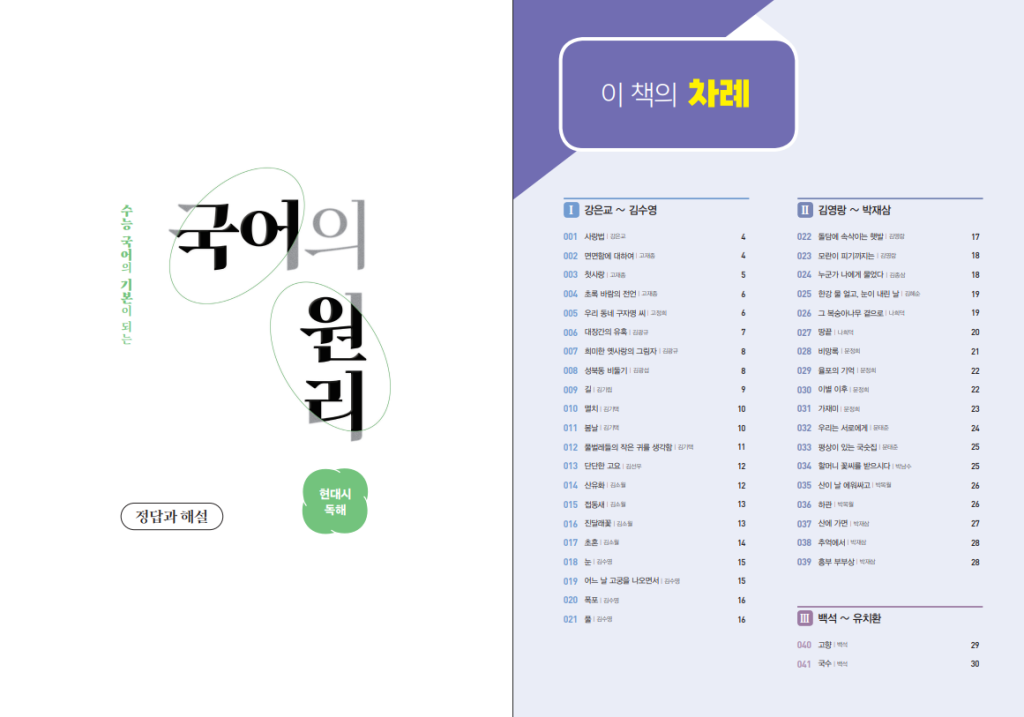 EBS 국어의 원리 현대시 독해(2022 개정 교육과정)는 현대시를 감으로 읽는 대신, 정해진 기준으로 차근차근 해석하게 만드는 교재입니다. 현대시는 단어가 쉬워 보여도 뜻이 한 번에 잡히지 않는 경우가 많고, 문제에서는 근거를 정확히 요구합니다. 이 책은 그런 부분을 해결하려고 6가지 독해 원리를 먼저 세우고, 그 원리를 작품에 반복 적용하는 방식으로 구성되어 있어서 내신과 수능의 기초를 함께 잡기 좋습니다. 아래 국어의 원리 현대시독해 답지 PDF 파일을 올려두도록 하겠습니다.