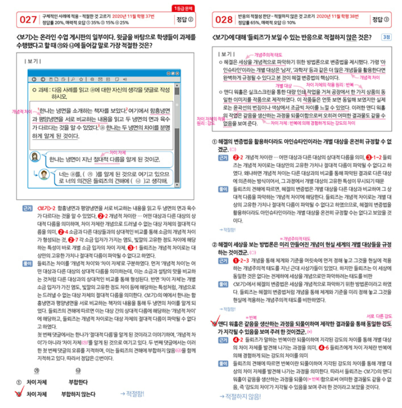 활용법은 평일에는 하루 2~3개 지문을 정해 권장 시간에 맞춰 풀고, 주말에는 오답만 모아 근거 문장을 표시하며 재학습하는 루틴이 효과적입니다. 틀린 문항은 해설의 근거 표시를 지문 원문에 그대로 옮겨 적고, 왜 오답인지 한 줄로 기록하면 다음 회독에서 판단 속도가 확연히 좋아집니다. DAY별 OMR 카드를 실제처럼 사용하면 시간 관리와 마킹 습관까지 동시에 잡을 수 있습니다. 학교 시험 대비로는 단원 범위에 해당하는 소재군을 우선 회전하고, 전주에는 미니 모의고사로 실전 감각을 끌어올리면 좋습니다. 이 책은 기출 누적과 근거 찾기 훈련을 한 권에서 끝내는 구조라, 고1 비문학 실력을 안정적으로 높이고 싶은 학생들에게 중심 교재로 권할 만합니다. 본문에 마더텅 고1 국어 독서 답지를 첨부해두었습니다.