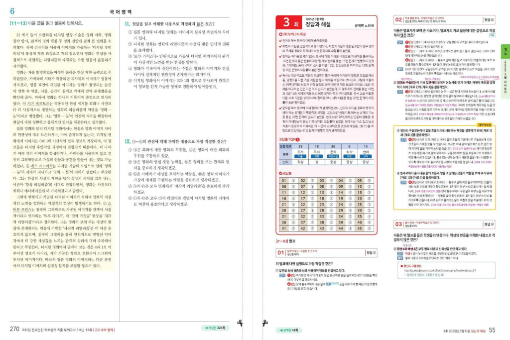 설명에 나온 특징을 보면, 해설에 지문과 문제가 그대로 들어가 있어서 독서나 문법처럼 지문을 다시 확인해야 하는 파트에서 이해가 끊기지 않게 돕는 방식입니다. 또 지문 내용을 구조화해서 보여 주는 모식도나 시각 자료를 제공하고, 독서는 그림·사진 자료를 보강해 이해를 돕는다고 되어 있습니다. 문학은 ‘지문 이해도’ 같은 장치를, 소설은 ‘인물 관계도’ 같은 정리 자료를 통해 내용을 잡아 준다고 하니, 읽고 나서 머릿속이 정리가 안 되는 학생에게 특히 유용합니다. 어휘·어구 풀이도 문맥에 맞춘 쉬운 설명이라고 되어 있어, 단어 때문에 지문을 놓치는 경우를 줄이기 좋습니다.