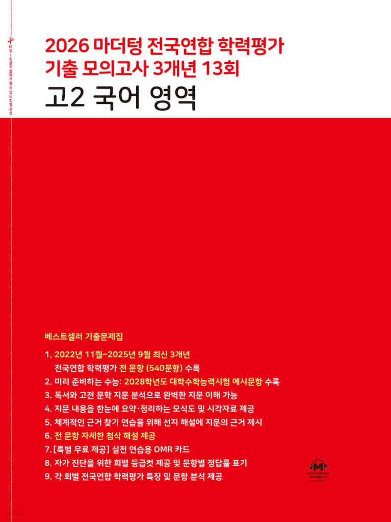 수록 내용은 2022년 11월부터 2025년 9월까지 최신 3개년 고2 전국연합 학력평가 12회, 총 540문항이고, 여기에 2028학년도 대학수학능력시험 예시문항이 한 회차로 추가되어 총 13회 구성이라고 안내되어 있습니다. 목차도 시간의 순서로 이어지고, 학기 흐름대로 풀기에 자연스럽습니다. 분량은 640쪽이라 해설이 아주 두꺼운 편이고, 단순히 정답만 보여 주는 게 아니라 지문 근거를 잡아 주는 방향으로 만들어졌다고 보면 됩니다. 아래 링크를 통해 2026 마더텅 모의고사 고2 국어 답지를 열람할 수 있습니다.