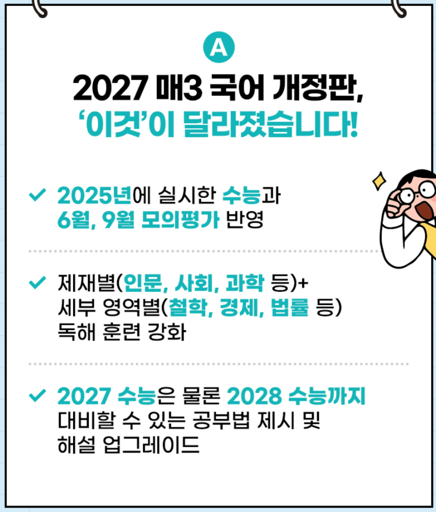 이 교재는 비문학 독서를 매일 일정량으로 고정해서 훈련하고 싶은 학생, 그리고 기출을 통해 실전 감각을 키우고 싶은 학생에게 추천할 만합니다. 하루 3지문이라는 단위가 부담스럽게 느껴질 수도 있지만, 대신 루틴이 잡히면 공부가 빨라지는 장점이 있습니다. 꾸준히 따라가면 독해력과 시간 관리가 함께 좋아질 가능성이 큽니다. 본문에 2027 수능 대비 매3비 답지 PDF 파일을 첨부해두었으니 학습에 함께 활용하시길 바랍니다. 매년 개정될 수 있으니 표지는 꼭 확인하시길 바랍니다.