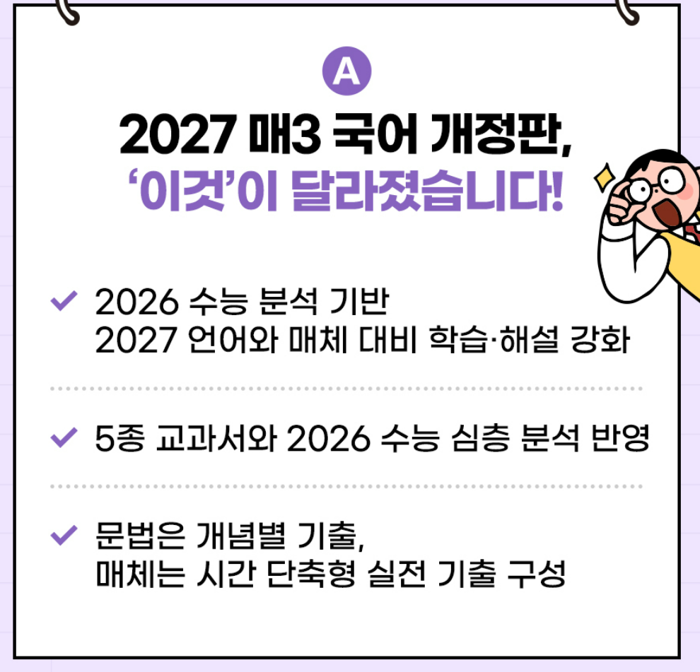 이 교재는 언어와 매체를 선택했는데 문법이 불안하거나, 매체 문제에서 시간에 쫓기는 학생에게 잘 맞습니다. 매일 조금씩 하는 방식이라 부담이 아주 크지 않으면서도, 시험 전까지 감을 유지하기가 쉽습니다. 국어 전체를 같이 끌어올리고 싶다면 매3비 같은 독서 기출과 함께 돌리는 것도 흐름이 잘 맞습니다. 마지막으로 매년 개정되는 교재이므로 표지는 꼭 확인하시고, 본문에 2027 수능대비 매3 언매 답지 pdf를 첨부해두었으니 학습에 참고하시길 바랍니다.