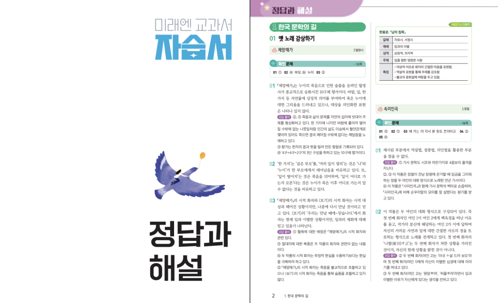 교과서 학습을 보다 체계적으로 정리하고 이해할 수 있도록 돕는 자습서입니다. 작품 이해, 개념 정리, 문제 풀이까지 단계적으로 학습할 수 있도록 구성되어 있어 수업 예습과 복습, 그리고 내신 대비 학습에 모두 활용할 수 있습니다. 국어 교과서의 내용을 정확하게 이해하고 학습 효과를 높이고자 하는 학생들에게 도움이 되는 교재입니다. 본문에 미래엔 공통국어2 자습서 답지를 첨부해두었습니다. 표지를 꼭 참고하시길 바랍니다.