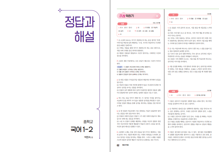 본책에서는 교과서에 수록된 모든 작품과 제재를 빠짐없이 다루고 있으며, 예시 답안과 함께 핵심 내용을 친절하게 풀어 줍니다. 소단원 학습을 시작하기 전에는 꼭 알아 두어야 할 내용을 한눈에 볼 수 있도록 정리해 주어 학습의 방향을 잡기 쉽습니다. 문학 단원에서는 작품의 주제와 표현 방법을 자연스럽게 이해하도록 돕고, 비문학 단원에서는 추론하며 읽는 방법을 단계적으로 설명해 주어 글 읽기에 대한 부담을 줄여 줍니다.