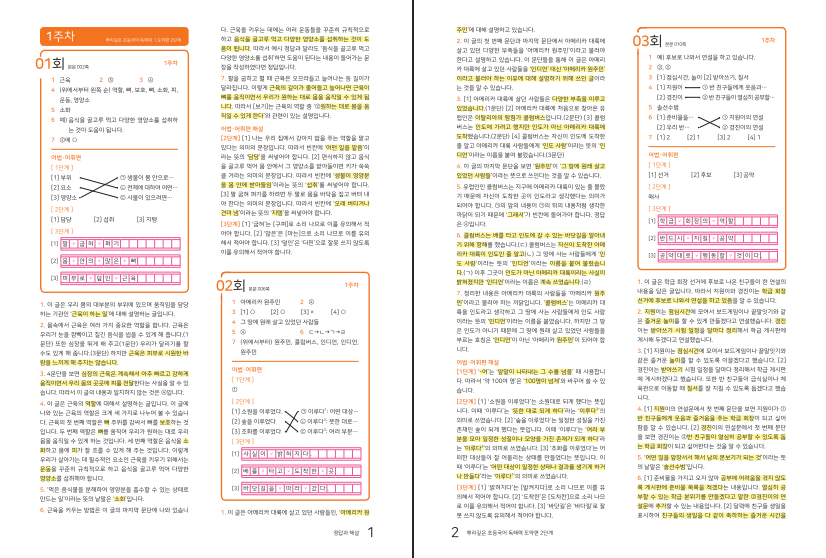 위 링크를 통해 뿌리깊은 초등국어 독해 도약2 답지를 열람할 수 있습니다. 학습 장치도 알차게 들어 있습니다. 매 회 주요 어휘를 복습하는 페이지로 단어 뜻과 쓰임을 다시 점검하고, 주말에는 퍼즐‧색칠‧퀴즈 같은 활동형 부록으로 흥미를 이어 갑니다. 문제 유형별 분석표는 아이가 어떤 질문에 약한지 한눈에 보여 주어 보완 학습에 도움이 됩니다. 성취를 표시하는 붙임딱지는 작은 보상 체계를 만들어 학습 동기를 유지하게 합니다. 보호자는 진도와 이해도를 동시에 확인할 수 있어 가정 지도에 실용적입니다.