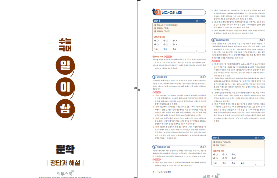 위 링크를 통해 수능 국어 일이삼 문학 답지를 열람할 수 있습니다. 문항 파트는 기출과 예상 문제를 적절히 배합하여 출제 경향을 학습하고 적용력을 점검할 수 있게 했습니다. 특히 2028학년도 수능 예시문항을 수록하여 새 체제의 문제 얼개를 미리 체감하고, 정답의 근거 라인을 명확히 표시하는 훈련을 반복할 수 있습니다. 자세한 해설은 오답 원인을 ‘근거 미확인·개념 오해·선지 비교 실패’ 등으로 분류해 주어, 같은 유형의 실수를 체계적으로 줄이도록 안내합니다.