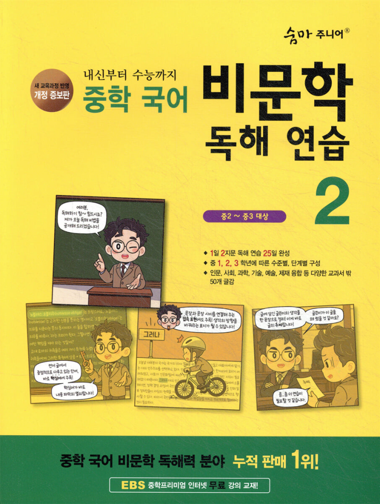 이 교재는 중학교 국어 독해 실력을 한 단계 더 끌어올리고 싶은 학생이나, 수능 독서 영역까지 대비하고 싶은 학생에게 특히 적합합니다. 다양한 유형의 지문과 문제를 반복적으로 풀어보면서 독해 속도와 정확도를 함께 향상시킬 수 있으며, 꾸준히 학습하면 전반적인 국어 실력 향상에 큰 도움이 됩니다. 교육과정이 바뀔 때마다 개정되므로 표지를 꼭 확인하시고, 본문에 22개정 숨마주니어 비문학 독해 2 답지 pdf 첨부해두었습니다.