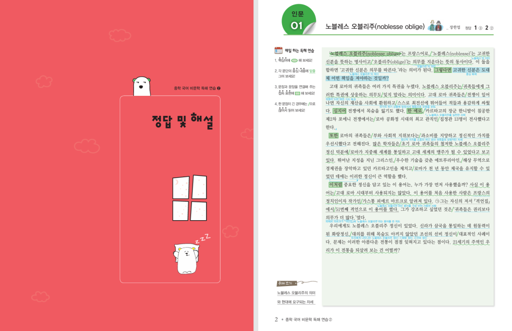 구성은 지문 분석 → 문제 풀이 → 어휘 정리 → 특강(내신·논술·문법)으로 이어지는 단계형 학습 구조로 되어 있어 매우 체계적입니다. 특히 각 지문마다 핵심 어휘를 따로 정리하고 테스트를 통해 확인할 수 있어 독해와 어휘 학습을 동시에 진행할 수 있습니다. 리뷰를 보면 다양한 제재의 글을 접할 수 있어 지루하지 않고, 해설이 상세해 혼자 공부하기에도 충분하다는 평가가 많습니다.