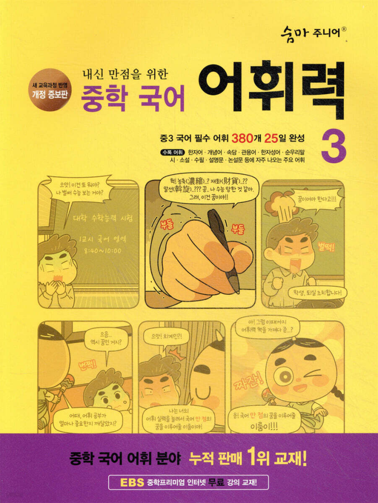 숨마 주니어 중학 국어 어휘력 3 (2026년)은 2022 개정 교육과정을 반영하여 중학교 국어 어휘 학습을 완성 단계까지 끌어올릴 수 있도록 구성된 어휘 중심 교재입니다. 중3 단계에서는 지문 길이와 난이도가 크게 높아지기 때문에 어휘 이해력이 성적에 직접적인 영향을 주는데, 이 교재는 교과서 기반 필수 어휘를 중심으로 구성되어 내신과 수능 대비를 동시에 준비할 수 있도록 도와줍니다. 특히 고등 국어까지 연결되는 어휘력을 미리 준비하려는 학생에게 적합하며, 아래에 숨마주니어 어휘력 3 답지 pdf도 올려두겠습니다.