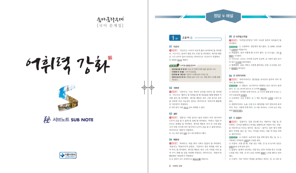 숨마쿰라우데 국어 어휘력강화 교재는 수능과 내신에서 필수적으로 요구되는 어휘 실력을 체계적으로 키울 수 있도록 구성된 15개정교육과정의 국어 어휘 학습서입니다. 고유어, 한자어, 관용어, 속담, 한자성어 등 다양한 어휘를 한 권으로 정리할 수 있도록 구성되어 있으며, 반복 학습을 통해 자연스럽게 익힐 수 있는 것이 특징입니다. 특히 국어 성적에서 어휘가 약한 학생이나 기본기를 탄탄히 다지고 싶은 학생에게 적합하며, 아래에 숨마쿰라우데 국어 어휘력강화 답지 및 해설 PDF를 올려두었으므로 함께 참고하시면 좋습니다.