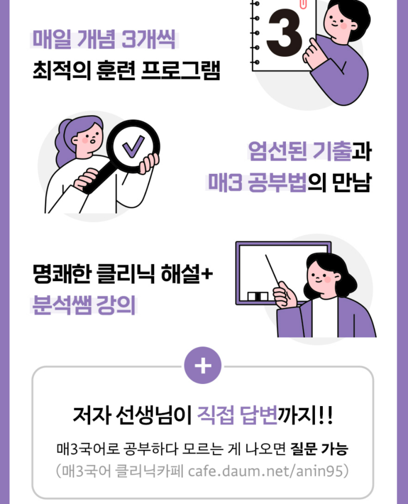 이 책은 문법 지식을 외우는 데서 끝내지 않고, 개념을 예시로 확인한 뒤 바로 개념별 문제로 적용하는 흐름을 잡아줍니다. 문법이 약하면 지문을 읽을 때도 문장이 헷갈리기 쉬운데, 이 교재는 필수 개념을 먼저 정리해 두고 매일 점검 문제로 다시 확인하게 만들어서 빈틈을 줄이기 좋습니다. 중간중간 제대로 채점하는 방법과 공부 계획표가 함께 들어가 있어서, 혼자 공부해도 흐름이 끊기지 않게 도와줍니다. 아래 링크로 예비 매3 문법 답지를 열람할 수 있습니다.
