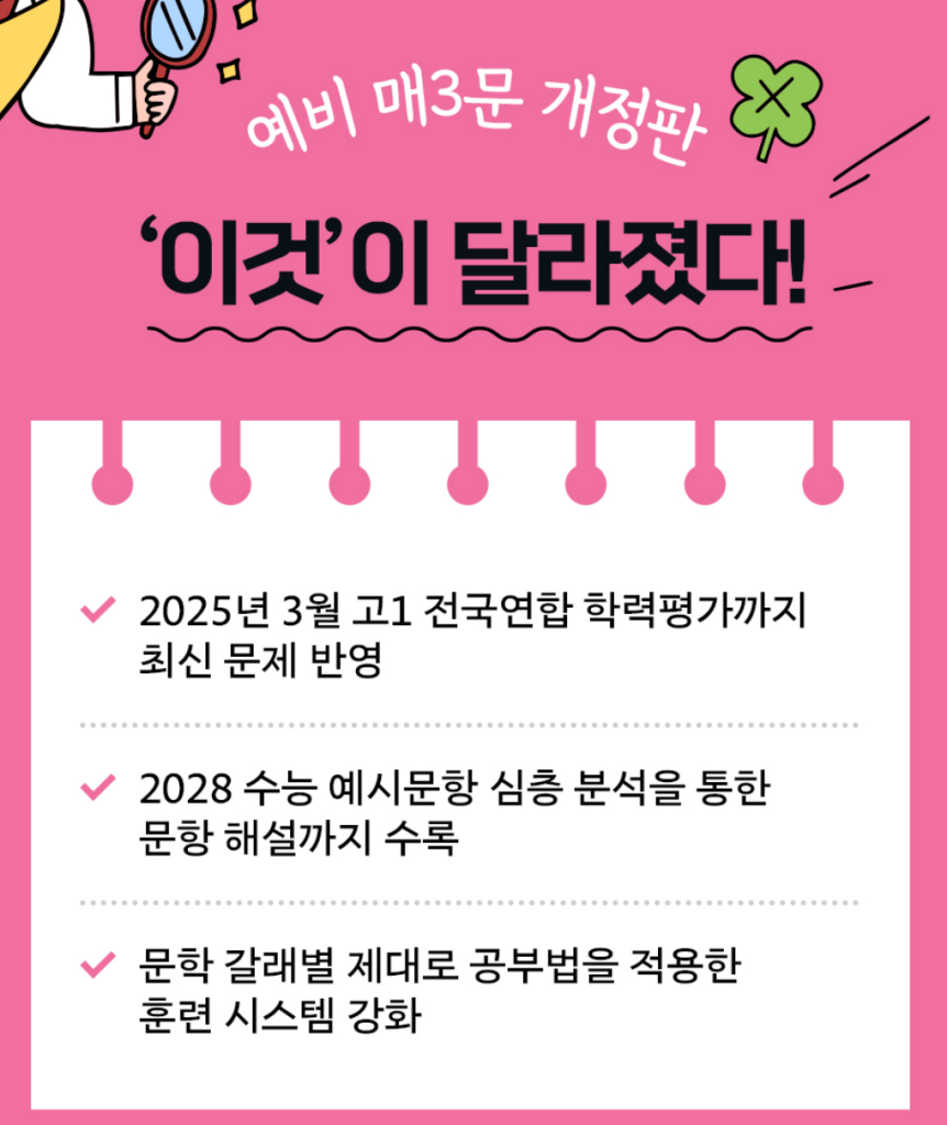 이 교재는 문학을 감으로 풀던 습관을 바꾸고, 갈래별 접근을 몸에 붙이고 싶은 학생에게 잘 맞습니다. 특히 문제 옆에 붙는 분석쌤 강의 같은 안내가 학습 흐름을 끊지 않게 도와줘서 매우 좋습니다. 거의 매년 개정되므로 표지는 꼭 확인하시길 바랍니다. 본문에 10개정판 예비 매3문 답지 pdf 첨부해 두었으니 공부하실 때 복습까지 이어가며 활용하시길 바랍니다.