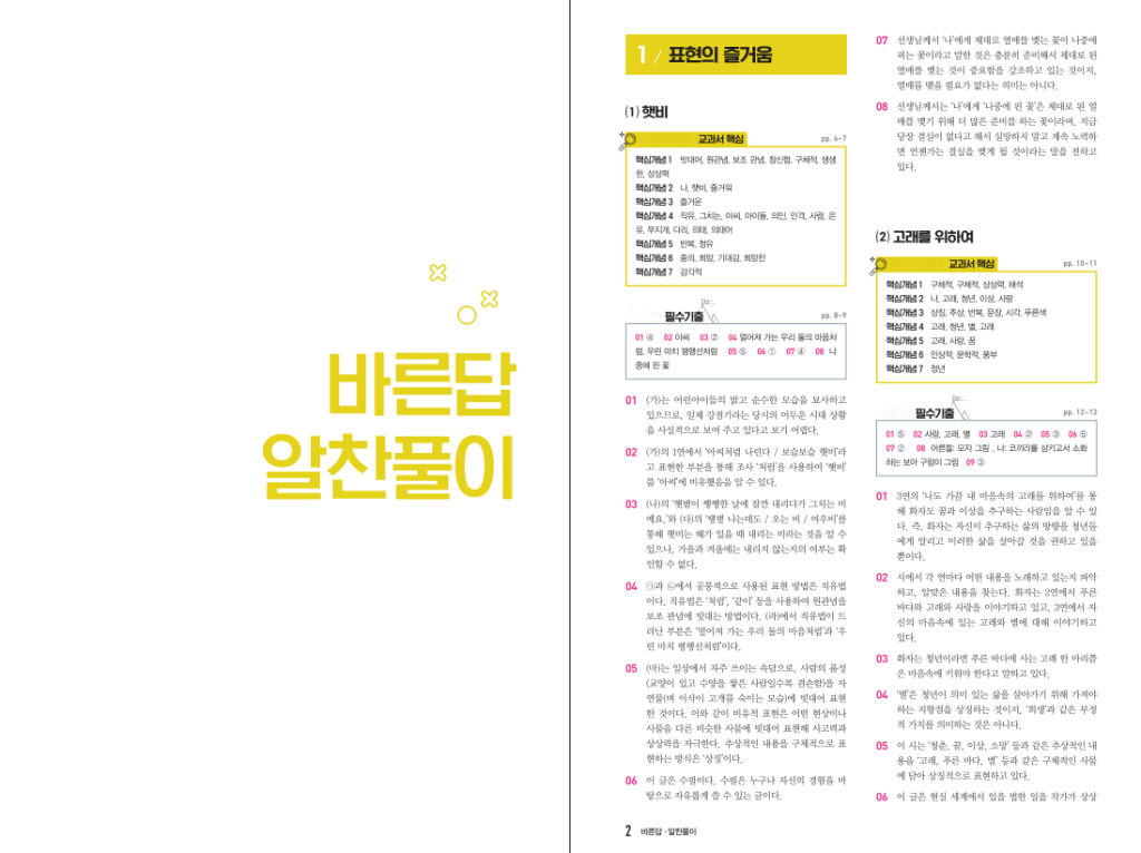 이 책은 크게 네 갈래의 단원으로 구성되어 있습니다. 먼저 「표현의 즐거움」에서는 ‘햇비’, ‘고래를 위하여’ 같은 작품을 통해 시와 산문의 표현 효과를 살피며, 글을 읽고 느낀 점을 말이나 글로 옮기는 연습을 하게 됩니다. 「읽고 대화하고」에서는 독서 일기 형식의 글과 책을 읽고 서로 대화하는 상황을 통해, 내용을 요약하고 자신의 생각을 정리하는 방법을 다룹니다. 「능동적인 언어생활」 단원에서는 예측하며 읽기, 어휘의 쓰임을 중심으로 글 읽기 전략을 익히고, 마지막 「성장의 시간」에서는 ‘보리 방구 조수택’과 같은 작품과 면담하기 활동을 통해 인물의 마음과 상황을 이해하고, 이를 말하기와 쓰기 활동으로 연결하는 구성을 가지고 있습니다. 교과서 목차와 연계되어 있어 학교 진도에 맞춰 한 단원씩 풀어 나가기 수월합니다.