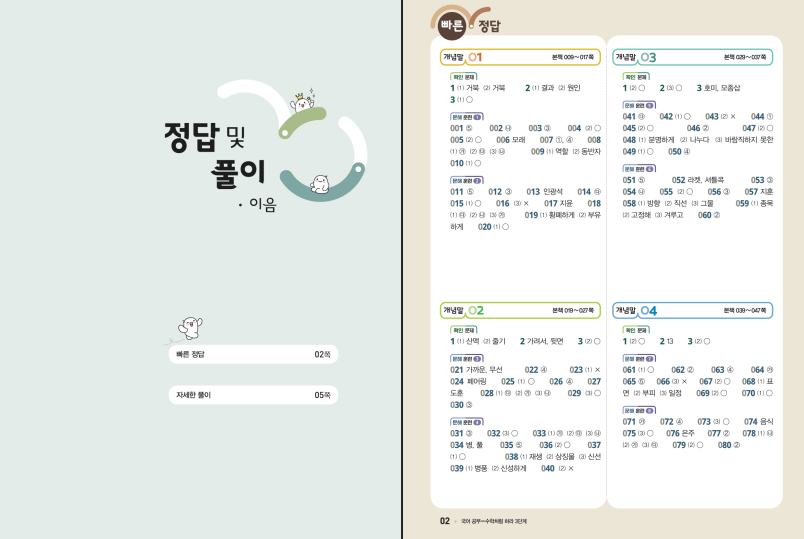 구성은 단단합니다. 먼저 ‘개념말×공식’에서 핵심 개념을 그림처럼 정리하고, 바로 ‘개념말×공식 확인 문제’로 짧게 점검합니다. 이어지는 ‘실전 문해 훈련’에서는 다양한 장르와 주제의 지문을 읽으며 핵심 문장 표시, 근거 찾기, 한 줄 요약을 연습합니다. 채점은 ‘빠른 정답’으로 간편하고, ‘자세한 풀이’와 ‘오답 이유’ 안내가 있어 혼공하는 아이도 왜 틀렸는지 이해하고 바로잡을 수 있습니다. 아래 링크를 통해 우공비 문해공식 초3 답지를 열람할 수 있습니다.