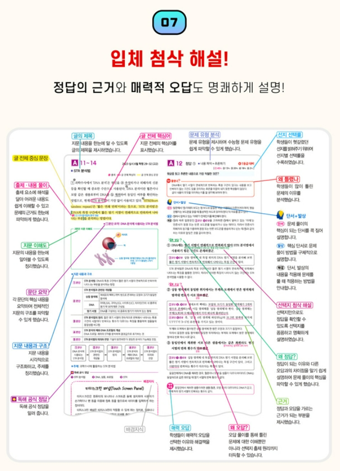 해설편은 혼자 공부하는 학생에게 특히 유용하게 구성되어 있습니다. 지문 전체를 실어 두고 선택지의 근거를 지문에 표시해 두어서, 왜 맞고 왜 틀리는지 근거 찾는 연습이 자연스럽게 됩니다. 고난도 문항은 단서와 발상, 왜 틀렸나 같은 코너로 분석해 주기 때문에, 같은 유형을 다시 만나도 흔들리지 않게 잡아 줍니다. 1등급 대비 문항에는 선택률까지 제시해 헷갈리기 쉬운 선지를 확인할 수 있고, 모든 지문에 어휘 풀이를 보강해 독해 후 바로 정리하는 흐름이 매끄럽습니다. 또 2028학년도 수능 예시 문항이 들어 있어 앞으로의 방향까지 같이 챙길 수 있습니다.
