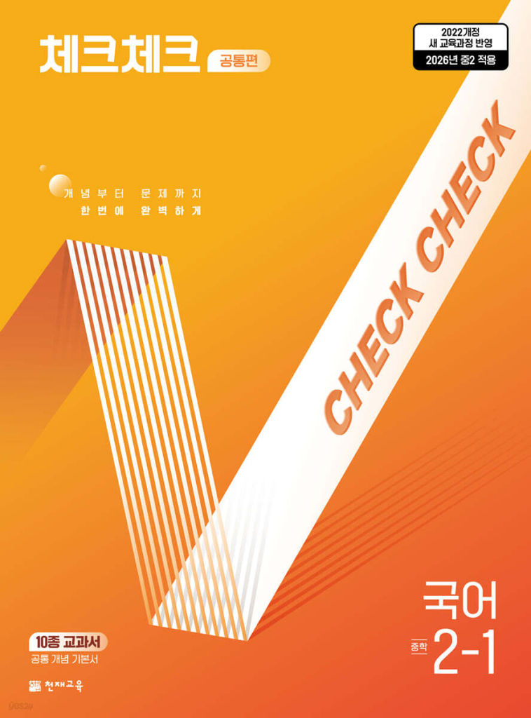 체크체크 공통편 국어 중 2-1 2026년은 2학년 1학기 국어를 개념부터 문제까지 한 번에 정리해 주는 공통 개념 기본서입니다. 학교마다 쓰는 교과서는 달라도 시험에 나오는 핵심 개념은 겹치는 부분이 많은데, 이 책은 여러 교과서에서 공통으로 중요한 내용을 뽑아 정리해 두어서 기본기를 잡기 좋습니다. 문학, 문법, 읽기, 듣기 말하기 쓰기를 한 권 흐름으로 묶어 두어 국어 공부를 어디서부터 시작해야 할지 막막할 때 특히 도움이 됩니다. 아래 체크체크 국어 중2-1 답지 pdf 올려두겠습니다.