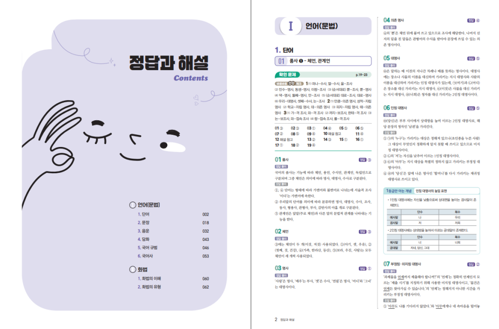 책의 구성은 문법과 화법으로 나뉘어 있어 공부 흐름이 분명합니다. 문법에서는 품사, 단어의 형성, 문장 성분과 문장 구조, 음운과 음운 변동, 국어 규범, 국어사까지 폭넓게 다루고 있습니다. 여기에 사전 활용하기 유형, 지문형 문제 풀이, 중세 국어 접근법처럼 학생들이 자주 어려워하는 부분을 따로 짚어 주는 코너도 들어 있습니다. 화법 영역에서는 대화와 협상, 발표와 연설, 토의와 토론까지 실제 시험에서 자주 다루는 유형을 정리하고 있어 학교 시험 대비에도 실용적입니다. 개념 학습 뒤에 확인 문제와 수능 다가가기 구성이 이어져서 배운 내용을 바로 적용해 볼 수 있다는 점도 장점입니다.