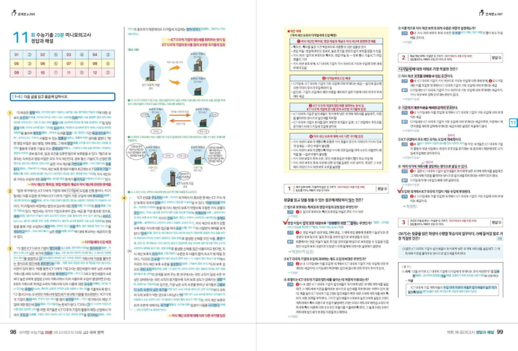 위 링크를 통해 마더텅 20분 모의고사 국어 답지를 열람할 수 있습니다. 문제를 많이 푸는 것만으로 끝나지 않고, 왜 맞고 왜 틀렸는지를 확인하는 과정이 중요합니다. 이 책은 어려운 어휘 풀이와 참고 자료, 추가 설명까지 담고 있어서 한 문제를 풀더라도 제대로 복습할 수 있게 도와줍니다. 회차별 OMR 카드도 제공되기 때문에 실제 시험처럼 시간 안에 체크하는 연습도 가능합니다. 특히 긴 공부가 부담스럽거나, 방학이나 학기 중에 매일 일정한 양으로 공부 습관을 만들고 싶은 학생에게 잘 어울립니다.