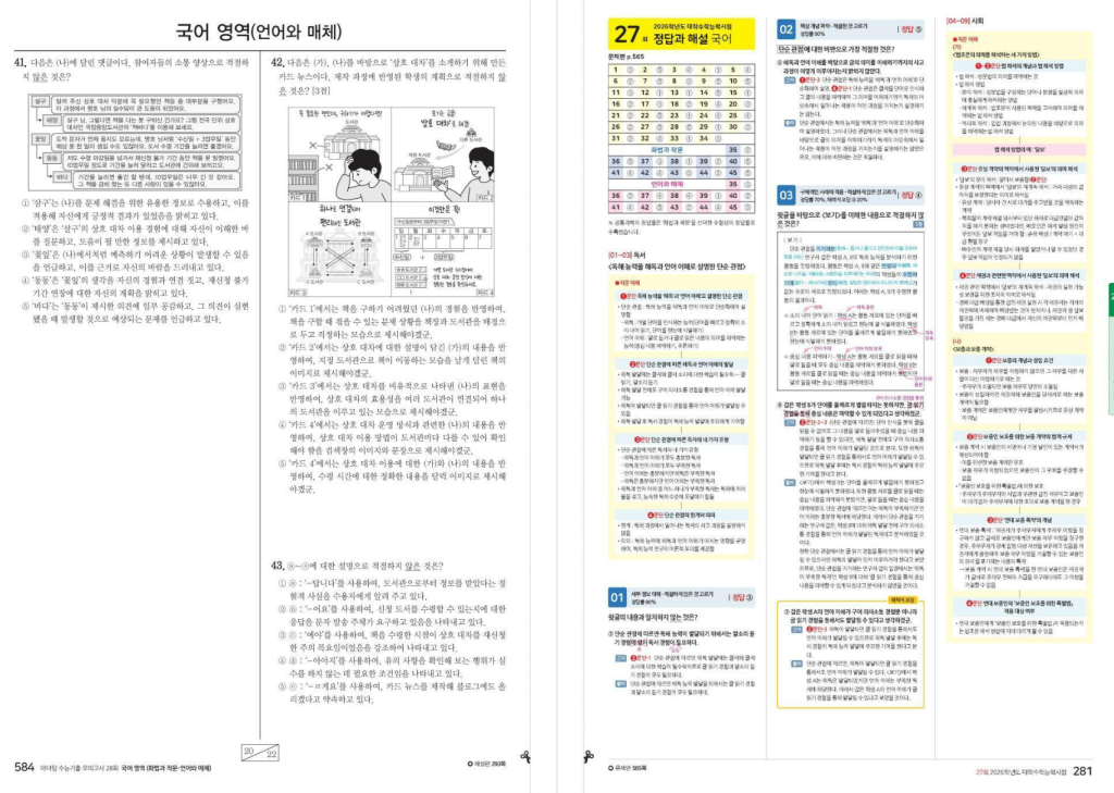 이 교재의 강점은 해설과 실전 자료가 탄탄하다는 점입니다. 지문 내용을 한눈에 볼 수 있도록 모식도와 시각 자료를 제시하고, 전 문항에 첨삭 해설을 제공해 혼자 공부하는 학생도 흐름을 따라가기 좋습니다. 또 정답률과 오답률이 높은 선택지 정보, 회별 등급컷까지 확인할 수 있어서 단순 채점이 아니라 자신의 약점을 분석하는 데 도움이 됩니다. 실전용 OMR 카드와 수능 안내 방송 자료도 제공되므로, 집에서도 실제 시험처럼 시간을 재고 푸는 연습을 할 수 있습니다. 국어는 많이 읽는 것도 중요하지만, 시험장에서 흔들리지 않는 훈련이 더 중요한데 이 책은 그런 실전 감각을 길러 주는 데 적합합니다.
