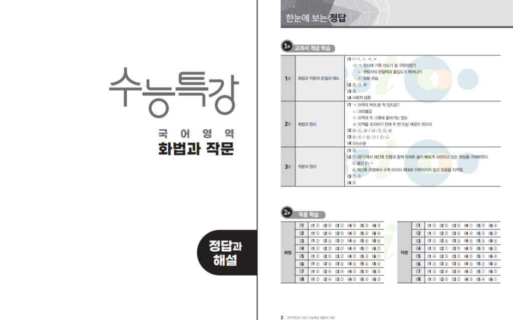 위 링크를 통해 27학년도 화법과 작문 수능특강 답지를 다운받으실 수 있습니다. 문제를 풀 때는 단순히 정답만 맞히는 데서 그치지 않고, 선택지 하나하나를 왜 고를 수 있는지, 왜 버려야 하는지를 점검하도록 유도합니다. 특히 화법 영역에서는 발화 의도와 상황 맥락을 읽는 연습이 반복되며, 작문 영역에서는 글의 목적과 조직 방식을 빠르게 파악하는 훈련이 가능합니다. 정답과 해설을 함께 활용하면 자신의 사고 과정에서 놓친 부분을 확인하기 좋아, 실수가 반복되는 패턴을 줄이는 데 도움이 됩니다.