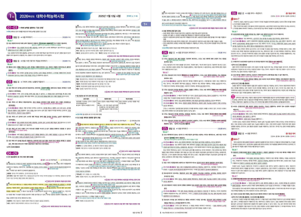 언매에서 점수 차이는 보통 시간 관리에서 크게 납니다. 문법은 한 문제에서 오래 버티면 뒤가 무너지고, 매체는 자료를 전부 읽고 시작하면 시간이 모자랍니다. 이 책은 실전 회차를 돌리면서 어디까지 읽고 판단할지를 스스로 정하게 만들고, 해설에 시각화된 첨삭 요소가 들어 있어 내가 놓친 근거가 무엇인지 바로 잡기 쉽습니다. 단서와 발상, 왜 틀렸나 같은 설명이 붙은 고난도 문제도 따로 정리되어 있어 1등급을 노릴 때 약점 보완에 도움이 됩니다.