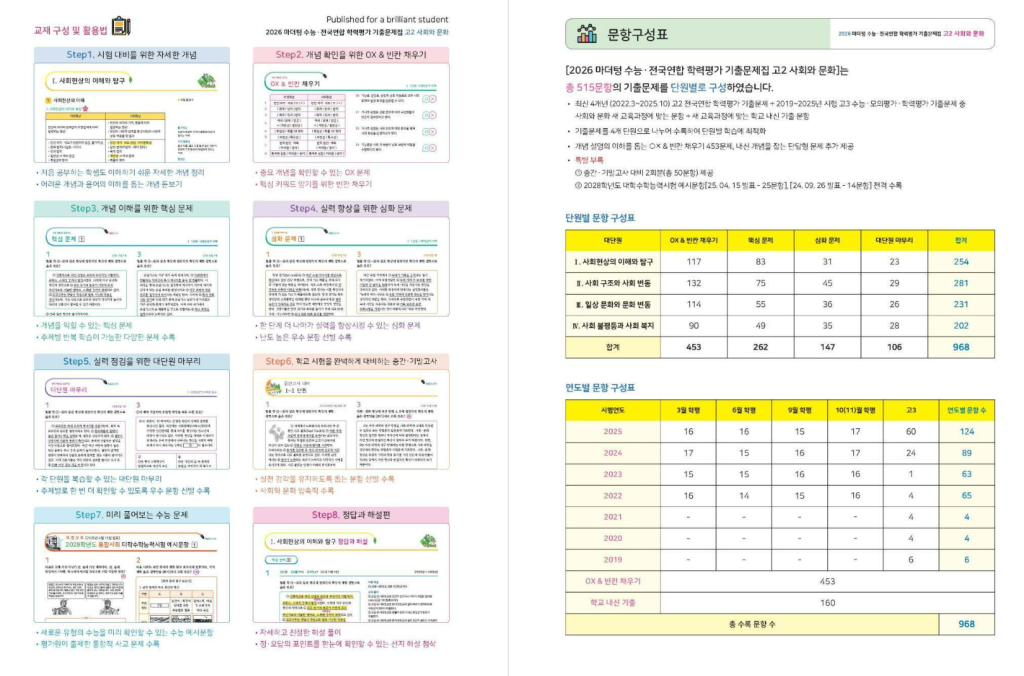 이 교재는 최근 4개년 전국연합 학력평가와 수능, 모의평가 문항 중 교육과정에 맞는 문제를 선별하여 500문항 이상을 수록하고 있습니다. 사회현상의 이해와 탐구, 사회 구조와 사회 변동, 문화와 문화 변동, 사회 불평등과 복지 등 핵심 단원을 체계적으로 다루고 있으며, 단원별로 난이도 순으로 문제가 배열되어 있어 단계적으로 실력을 쌓을 수 있도록 구성되어 있습니다. 또한 OX 문제와 빈칸 채우기, 단답형 문제 등 다양한 유형을 통해 개념을 확실하게 정리할 수 있습니다.