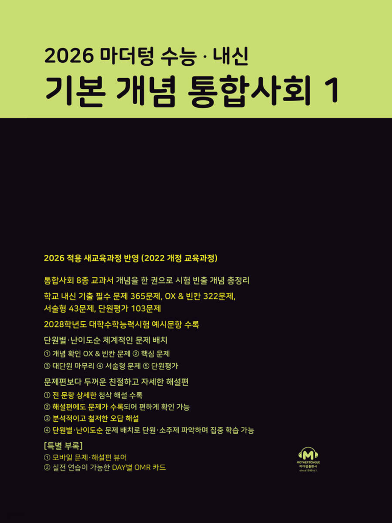 마더텅 수능 · 내신 기본 개념 통합사회1 (2026년)은 2022 개정 교육과정을 반영하여 고등학교 통합사회 과목의 핵심 개념을 한 권으로 정리할 수 있도록 구성된 개념 중심 교재입니다. 통합사회는 다양한 분야의 내용을 함께 이해해야 하는 과목이기 때문에 개념 정리가 매우 중요한데, 이 교재는 교과서 8종의 내용을 통합하여 체계적으로 정리해주는 것이 특징입니다. 내신과 수능을 동시에 준비하려는 학생에게 적합하며, 아래에 마더텅 기본개념 통합사회1 답지 및 해설도 함께 참고하시면 좋습니다.