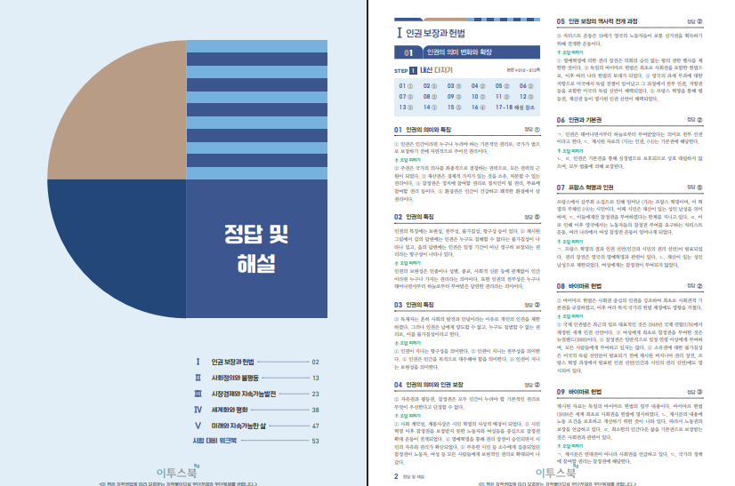 단원 구성은 ① 인권 보장과 헌법, ② 사회정의와 불평등, ③ 시장경제와 지속가능발전, ④ 세계화와 평화, ⑤ 미래와 지속가능한 삶으로 이어집니다. 각 단원은 ‘핵심 개념–현안 자료–적용 문제’의 구조를 따르며, 헌법 조문·그래프·지도로 개념을 실제 사례에 접속시키는 데 집중합니다. 예를 들어 정의 단원은 다양한 정의관을 대비시켜 시험에서 자주 묻는 ‘관점별 기준’ 혼동을 막고, 경제 단원은 합리적 선택부터 국제 분업까지 한 줄의 인과로 묶어 서술형의 근거 쓰기까지 연결되도록 구성했어요. 남북 분단·동아시아 갈등, 인구·에너지 문제처럼 시사성이 높은 주제도 흩어지지 않게 핵심 쟁점과 해법의 틀을 먼저 잡아 줍니다.