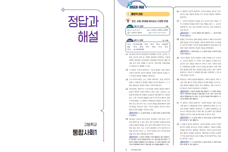평가문제집 고등 통합사회 2 (22개정)은 2022 개정 교육과정을 반영하여 고등학교 1학년 통합사회 2 교과서와 연계된 내신 대비 전용 교재입니다. 본책 128쪽, 실전 대비 문제집 40쪽, 핵심 노트 32쪽, 정답과 해설 56쪽으로 총 256쪽에 이르며, 교과서의 핵심 개념을 정리하고 시험 출제 가능성이 높은 자료를 선별하여 체계적으로 학습할 수 있도록 구성되어 있습니다. 학생들이 복잡한 사회 개념을 쉽게 이해하고 시험에 대비할 수 있도록 설계된 점이 특징입니다. 아래 비상교육 통합사회2 평가문제집 답지 pdf 파일을 올려두도록 하겠습니다. 표지를 꼭 확인하시길 바랍니다.