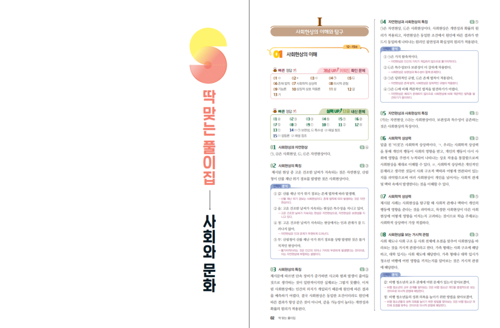 위 링크를 통해 22개정 고등 셀파 사회와 문화 답지를 열람할 수 있습니다. 문제 구성은 단계가 뚜렷해서 공부 방향을 잡기 편합니다. 개념을 읽고 난 뒤 바로 풀 수 있는 키워드 확인 문제로 기본을 점검하고, 학교 시험에 자주 나오는 유형을 모아 둔 단골 내신 문제로 적용 연습을 하며, 서답형 중심의 문제로 등급을 끌어올리는 흐름입니다. 사회와 문화는 서술형에서 개념을 정확히 쓰는지, 자료를 근거로 말하는지를 많이 보는데, 이 책은 서술형·논술형까지 폭을 넓혀 실전 대비를 하도록 설계되어 있습니다. 또한 1등급을 목표로 하는 난이도 문제와 통합사회와 연결되는 수능형 문제도 언급되어 있어, 내신만이 아니라 사고력을 묻는 형태의 문항에도 익숙해질 수 있습니다.