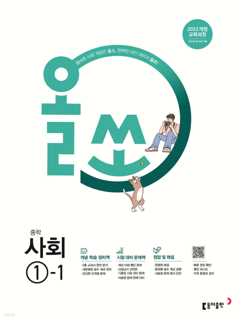 올쏘 중학 사회 1-1 (2026년)은 중1 1학기 사회를 학교 시험 중심으로 차근차근 잡아주는 내신 대비서입니다. 2022 개정 교육과정을 반영한 구성이라서 새 교과서 흐름에 맞게 공부하기 좋고, 개념을 그냥 외우는 방식이 아니라 자료를 읽고 해석하는 연습까지 같이 하게 되어 있습니다. 사회는 글을 이해하는 힘과 지도를 읽는 힘이 같이 필요해서 처음부터 방향을 잘 잡는 게 중요한데, 이 책은 그 부분을 교과서 개념 정리와 자료 분석으로 먼저 받쳐주는 편입니다. 아래 올쏘 사회 중1-1 답지 PDF 파일을 올려두도록 하갰습니다. 표지를 꼭 확인하시길 바랍니다.