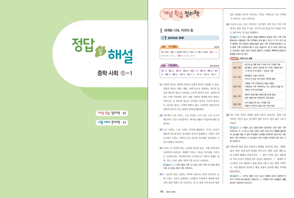 내용은 ‘세계화 시대, 지리의 힘’을 시작으로 아시아, 유럽, 아프리카, 아메리카, 오세아니아와 극지방까지 이어지며, 중1에서 배우는 세계 지리 단원을 한 바퀴 돌게 되어 있습니다. 각 단원에서 위치와 자연환경, 인구와 문화, 산업과 변화 같은 시험 포인트를 중심으로 정리하기 때문에, 단원별로 왜 이런 현상이 생겼는지를 연결해서 이해하는 데 도움이 됩니다. 특히 지형도, 기후도, 백지도 같은 부록이 있어 지도 학습이 약한 학생도 반복 연습으로 기본기를 만들 수 있게 되어 있다는 점이 장점입니다.