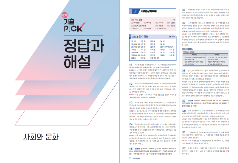 위 링크를 통해 완자 기출 pick 사회와문화 답지를 열람할 수 있습니다. 세 번째인 ‘일상 문화와 문화 변동’은 학교 시험에서 자료·사례형으로 자주 나오기 때문에 연습이 꼭 필요한 파트입니다. 대중문화, 미디어 분석과 생산, 하위문화와 문화 다양성, 문화의 세계화처럼 우리가 실제로 접하는 주제가 많아서 문제에서는 사례를 제시하고 개념을 맞히게 합니다. 마지막 ‘사회 불평등과 사회 복지’에서는 계층과 불평등 현상을 구분하고, 여러 불평등 모습이 왜 생기는지, 복지 제도가 무엇을 목표로 하는지 정리합니다. 여기서도 “비슷해 보이는 용어의 차이”가 점수를 갈라서, 기출 기반 문제를 많이 풀어 보는 방식이 잘 맞습니다.