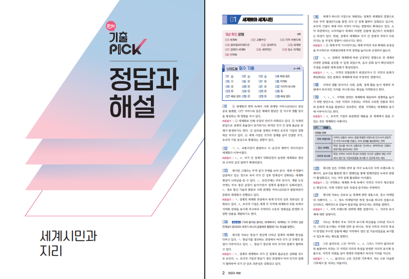 완자 기출 PICK 세계시민과 지리 (2026년)은 2022 개정 교육과정을 바탕으로, 내신에서 실제로 나오는 기출 중심으로 공부하도록 만든 문제·개념서입니다. 세계시민과 지리는 개념도 중요하지만, 자료와 보기 문장을 어떻게 읽느냐가 점수에 큰 영향을 줍니다. 이 책은 전국 학교 기출문제를 분석해 “시험에 나오는 내용만” 골라 개념을 다시 정리하고, 꼭 풀어야 할 문제를 모아 놓은 것이 핵심입니다. 개념서를 한 번 돌렸는데도 점수가 불안한 학생에게 특히 맞는 구성입니다. 아래 완자 세계시민과 지리 답지 PDF 파일을 첨부해두도록 하겠습니다.