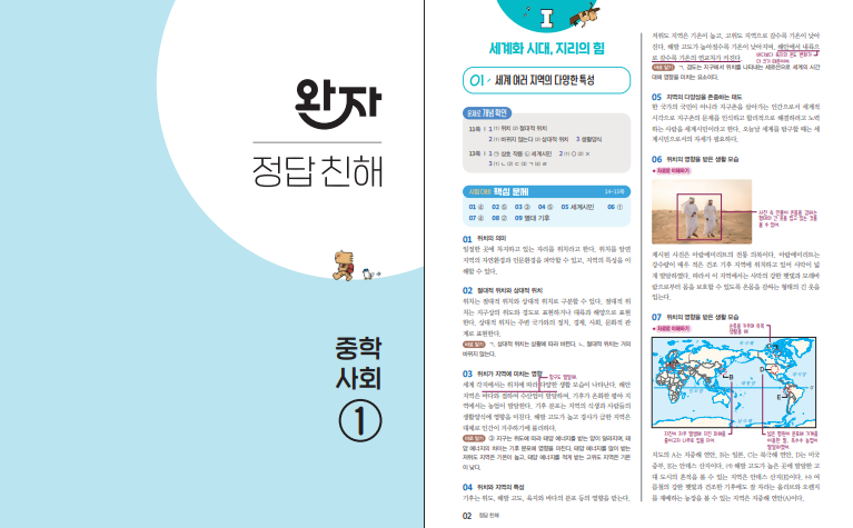완자 중학 사회 1 (2026년용) 완벽한 자율학습서는 중학교 1학년 사회 전 범위를 한 권에 정리할 수 있는 종합 문제집입니다. 2022 개정 교육과정을 반영해 세계 지리와 정치·사회, 법·인권까지 모두 다루고 있어서, 한 학기 교과서만 보는 것이 아니라 중1 사회 전체 흐름을 한 번에 잡고 싶은 학생에게 잘 맞는 구성이입니다. 세계화 시대의 지리적 특징부터 민주주의와 시민, 일상생활에서 만나는 법과 인권까지 이어지기 때문에, 사회 과목에 처음 입문하는 중1 학생이 “사회가 왜 중요한지”를 스토리처럼 이해하도록 도와줍니다. 아래 완자 중학사회1 답지 파일을 올려두도록 하겠습니다. 표지를 확인하시길 바랍니다.